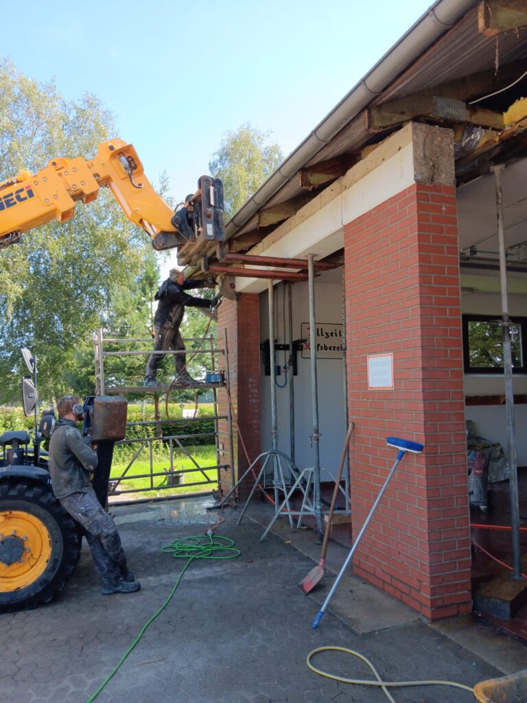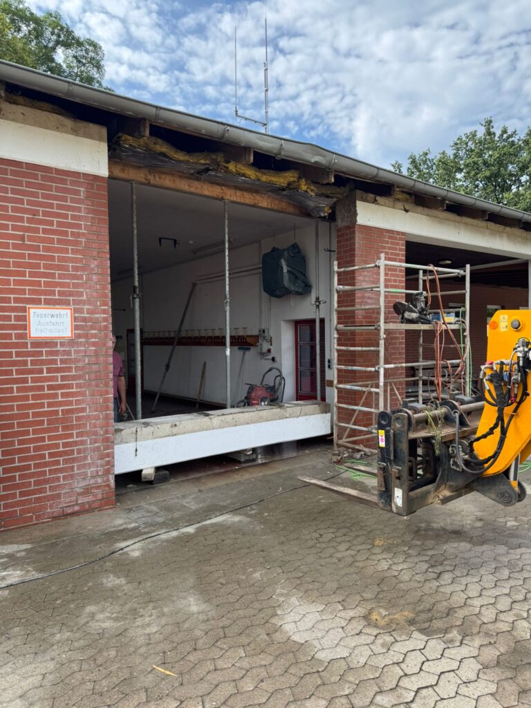 In mehrwöchiger Arbeit wurden alle Tore unserer Fahrzeughalle ersetzt. Bevor allerdings die neuen Tore eingebaut werden konnten, mussten einige Arbeiten durchführt werden. So wurden die drei Stahlbetonstürze herausgeschnitten und durch Stahlträger ersetzt. Notwendig wurden diese Arbeiten, da die Durchfahrtshöhe für unser neues, zurzeit in Beschaffung befindlichen TLF3000, nicht mehr ausreichen wird. Außerdem entsprachen die alten Tore energetisch und technisch nicht mehr den Anforderungen. Die neuen Tore verfügen über eine Ampelanlage, sowie einen elektrischen Antrieb und erleichtern den Einsatzkräften wesentlich die Ein- und Ausfahrt mit den Einsatzfahrzeugen. Zudem wurde in dem Zuge noch eine neue LED-Beleuchtung, zur Ausleuchtung des Vorplatzes unseres Feuerwehrhauses installiert. Kürzlich konnten wir unser Feuerwehrhaus wieder einräumen.